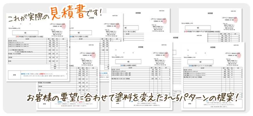 このように、お客様によって様々な要望があるかと思いますので、お客様の要望に合わせて、塗料別に3~5パターンの見積書を提出いたします。