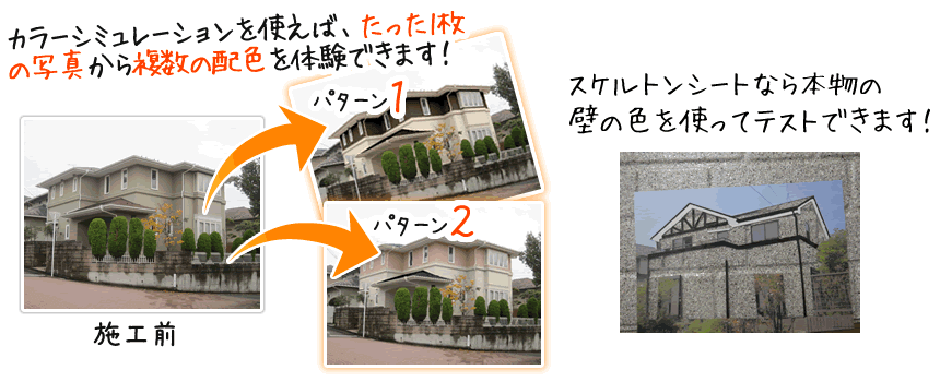 八戸ペイントでは、このような失敗をなくすために、無料でカラーシミュレーションやスケルトンシートで作成した配色パターンを提出いたします。