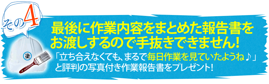 このようなことを思うのは当然だと思います。私も逆の立場なら同じことを思います。八戸ペイントでは、このようなお客様にも安心していただけるように、作業内容をまとめた報告書を写真付きで作成し、施工完了後にお渡しします。