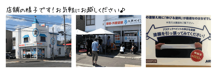 八戸ペイントでは、「みんなをしあわせにする。青森の未来を塗装で明るくする。」というモットーの元、施工に自信があるからこそ、絶対に逃げないからこそ、塗装店では珍しい目立つ区画にショールームを作りました。